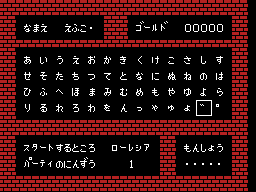 五十音のウインドウが閉じ,ゴールド・紋章・スタート地点・パーティの人数を入力する画面になります。デフォルトはゴールド0・紋章なし・ローレシアからのスタート・人数1となっています。方向レバーで矢印を動かし,変更したい項目に合わせAボタンを押すと,変更することができます。 変更が終わったらBボタンを押すことで STEP 5 に進みます。 |