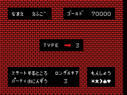 TYPEを選択します。デフォルトはパーティの人数が1のときTYPE=0,パーティの人数が2,3のときTYPE=3となっています。Aボタンを押すと0〜3の範囲で変更できます。 Bボタンを押すと STEP 6 に進みます。 |