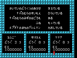 ローレシアの王子の所持するアイテムを入力する画面です。右側にあるのがアイテムの名前(2文字に短縮している)の一覧です。左側が,現在決定した,または選択中のアイテムのフルネームです。方向レバーで青いカーソルを動かし,入力したいアイテムにカーソルを合わせ,Aボタンで決定します。また,装備できるアイテムの場合,Bボタンを押すと「E」マークが表示されます(もう一度Bボタンを押すと元に戻る)。「E」マークがある状態でAボタンを押すとそのアイテムを装備した状態で入力されます。STEP 6 で指定した数量分アイテムを入力すると,自動的に STEP 8 に進みます。 ※ STEP 6でローレシアの王子のアイテム数を0にした場合はこの画面は表示されません !! |