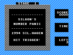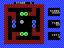 画面上の数字ブロックを消していくパズルゲーム。ブロックを押し, 数字ブロックどうしを法則に従い重ねると消すことができる。全部消 すとクリア,タイムアップ後に表れる敵に捕まるとアウト。全16面。