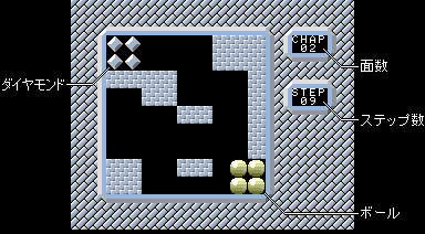 画面上にある4個のボールをジョイスティックで動かします。4個のボールは同時に動き,壁か他のボールに当たると止まります。そのとき,ボールがすべてダイヤモンド(?)の上にのっていれば面クリアです。
