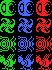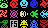 虫型のキャラクターがぞろぞろいますが,アリ,ハエ,目玉虫の3種類×4色の敵キャラクターをそれぞれ8方向(目玉虫は4方向)に向かせたものです。これもやはり,斜め向きのキャラクターの作成に苦労しました。このうち目玉虫は「COLOR MONSTERS」にも登場した敵キャラクターです。さすがに目玉虫の斜め向きは無理があったので4方向となりました(苦笑)。また,敵キャラクターの強さを色分けしているのは私のゲームではよくある典型的なパターンです。 |